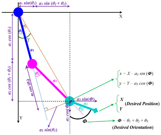 The inverse kinematic problem of the SLE involves determining the joint angles needed to achieve the desired position (X, Y) and orientation (Φ) of the end effector (foot) (Figure 5). Specifically, (7)–(14) show the relationship between the joint angles and the desired position and orientation of the end effector. Equation (7) releases the x and y coordinates of the second link (shank) with respect to the desired position (X, Y) and orientation (Φ) of the end effector (foot).