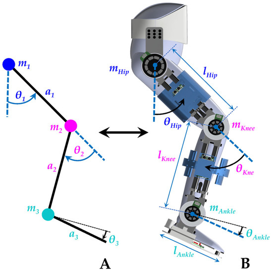 For a 3-DOF coupled human–exoskeleton system (Figure 2A), we obtained the following: