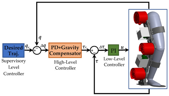 Relying on human–exoskeleton dynamic models, model-based control strategies can provide direct access to the gravity vector of the model, which can then be effectively utilized for gravity compensation [35]. In the gravity compensation scenario, an LLE assists its user in following a standard gait trajectory, while the user never feels the extra weight and inertia of the LLE. While a gravity compensator may be less crucial for lightweight single-joint exoskeletons, it is critical for multi-joint LLEs, which have significantly more weight. If gravity is not compensated for high-mass LLEs, the level of assistance provided to the user is reduced [32]. Some studies have benefited from gravity-compensator advantages in their LLE controller design [32,36,37]. However, only a very limited number of studies have employed this strategy to fully compensate for the gravity impact on multi-joint LLEs, which need complex dynamic modelling [38].