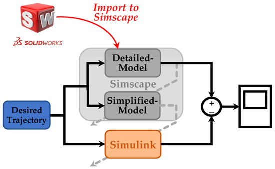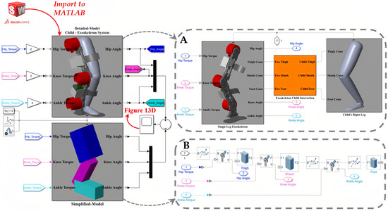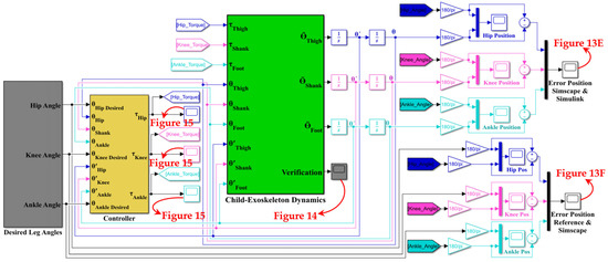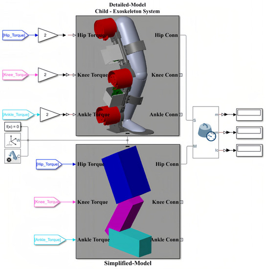 The presented inverse dynamics model is directly implemented to model the coupled human–exoskeleton system in MATLAB Simulink®. This approach enables the simulation of the system’s behavior under different conditions and facilitates the analysis of its dynamics.