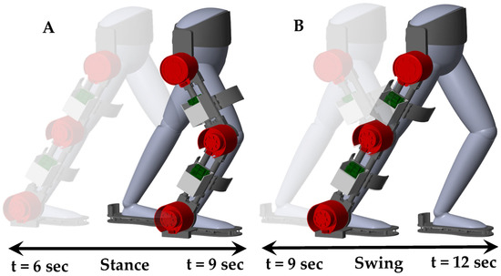 This study considers the coupled human–exoskeleton system as an integrated system and tries to model the dynamics of the coupled human–SLE system [65,66,67]. The dynamic models of coupled human–LLEs are usually presented by the inverted pendulum approach, as shown in Figure 6 [68,69]. The robotic SLE can be considered a fixed-base mechanism; therefore, the dynamic modeling and control approaches of fixed-base manipulators can be efficiently employed [65]. The overground gait cycle is divided into two main phases: the swing phase and the stance phase. During the swing phase, the SLE can be simplified as a hanging triple pendulum, operating under the assumption that the hip remains stationary. This simplification allows for a more straightforward analysis and control design for the exoskeleton during this phase of the gait cycle. In the stance phase, on the other hand, the exoskeleton is modeled as an inverted pendulum, with the ankle joint acting as the fixation point. This modeling approach captures the inherent dynamics and stability characteristics of the exoskeleton during the weight-bearing portion of the gait cycle [54].