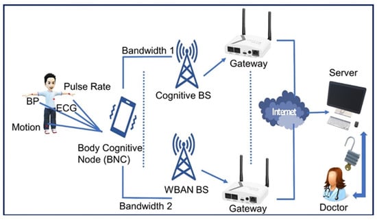 A CRN moderates interference and enhances the effectiveness of the limited spectrum usage. In order to prioritize the access of the frequency channel, there are two types of users: primary and secondary. Primary users are favored compared to secondary users because of real-time and crucial data transmissions and because they have higher priority in choosing the available bandwidth. Spectrum sensing now requires sensing the idle bandwidth information to route the data, and the next step is to access the bandwidth. Bandwidths access functions coordinate to sense the idle spectrum and update the WBAN’s channel access time. The amount of radio spectrum required for applications, such as mobile telephony, digital video broadcasting (DVB), wireless local area networks (Wi-Fi), wireless sensor networks (ZigBee), and the Internet of things [15,16], is immense and continues to rise. By 2021, nearly 50 billion cellular devices will be linked, necessitating a significant amount of spectrum [17]. The CR- based paradigm is explored for a routing mechanism in [18], whereas the contention window-based mechanism is explored in [19]. In [20], a channel-hopping mechanism is designed where secondary users can avail the network without clock synchronization at the global level. It improves throughput and average time. The main benefit is that it provides wireless devices with opportunistic access to more bandwidth, allowing them to boost their achieved throughput [21]. Intrusion detection is the method of detecting harmful or illegal computer or network activities in CRNs [22]. Better use of existing spectrum resources has been accomplished with the aid of CRNs [23] by leveraging underutilized licensed spectrum [24,25]. For automation applications based on wireless communication, cognitive radio considerably reduces spectrum scarcity [26]. Secondary users (SU) in mobile cognitive ad hoc networks regularly detect the behavior of main users (PU) and opportunistically utilize PU’s idle licensed channels [27]. It is critical to develop viable techniques to deal with interference, and to make efficient use of temporarily accessible frequency bands in order to maintain a high degree of communication quality [28,29]. It is also observed that various related schemes in the literature provide high computational complexities in terms of deployment. These complexities enhance the cost of the whole system, which renders the structure difficult to maintain. The best resource distribution for cooperative CRN with opportunistic licensed spectrum access is examined. CRN is used as a protocol to forward encrypted data towards the server. Therefore, CRN is an optimal and cost-effective selection as a protocol for data delivery.