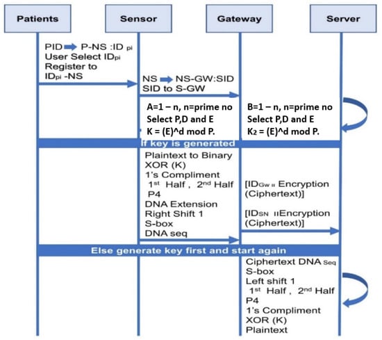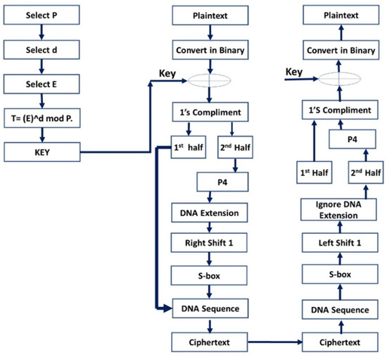 The receiver receives encrypted data that is not readable at step (28). First, the DNA sequence of the ciphertext is substituted with their corresponding binaries. The S-box is applied to the generated values of step 2. A circular left shift is performed on the 8-bit data. The 8 bits of data is divided into two halves, which form two subsets of 4 bits. The second half of the bits in step 5 are ignored, as they are DNA-extended bits. Now, parameter 4 (P4) is applied on the first half of these bits and combined with the previously assigned bits—which forms 8 bits of data. One’s compliment of the resulting 8-bit data is taken. Now, the XORed operation is performed with the ElGamal key generation algorithm. The value is then translated into ASCII decimal places after all the decryptions. The SDEA is a secure algorithm that has a low computation time and a good response and renders it difficult for attackers to intercept plaintexts.