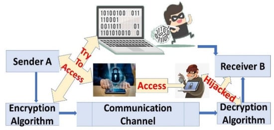 After obtaining the plaintext and ciphertext, the attacker may attempt to analyze the relationship between the plaintext and ciphertext. In cryptography, this is a very basic attack. The attack scenario is where the user sends the data for encryption and the piece of plaintext is encapsulated by the attacker, as shown in Figure 4. With this known piece of data, the attacker attempts to recover the encryption algorithm that is then used as for the decryption process, where P is plaintext that transmits data with a ciphertext pair from A to B, and Z is the attacker that attempts to recover data with known plaintext. Our introduced work prevents plaintext attacks as the users do not send simple plaintext over the network. A known plaintext attack necessitates the recovery and analysis of a matched plaintext and ciphertext pair. The purpose is to determine which key was used. If the attacker recovers the key, then the attacker can decode other ciphertexts encrypted with the same key. Plaintexts always use the El Gamal key generator that uses randomly chosen parameters, which are extremely hard for the attackers to discover.