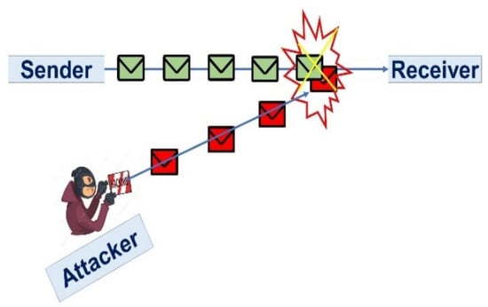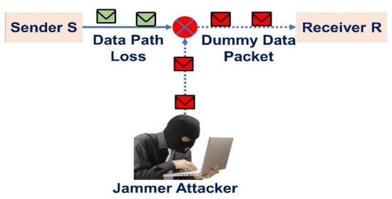 Jamming is an attack which interferes with the frequencies of the radio that the nodes of a system are using. It is a subset of denial of service (DoS) attacks. The data transmission path between the sender and receiver is dropped because of a jamming attack. The attacker constructs an alternative communication path with the receiver, as presented in Figure 5. The data transmission path between sender S to receiver R is dropped and the jamming attacker Z links a new path to transmit dummy data packets to receiver R as . Our proposed technique prevents this attack due to CRN. A cognitive network uses a priority-based and idle bandwidth spectrum for data transfer. The data transmission path is not obstructed by this idea. Data collision has also been prevented due to the adaptation of the idle spectrum.