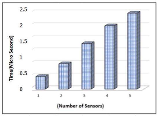 The computational time interval of sensors’ authentication of patients and gateways is observed. It is noted that as the time to register tiny sensors increased, the response time also increased—e.g., when sensor1 registers in 0.5 microseconds then the 5 micro sensors take about 3 microseconds. Figure 7 illustrates that the overall time taken to authenticate people is slower and efficient.