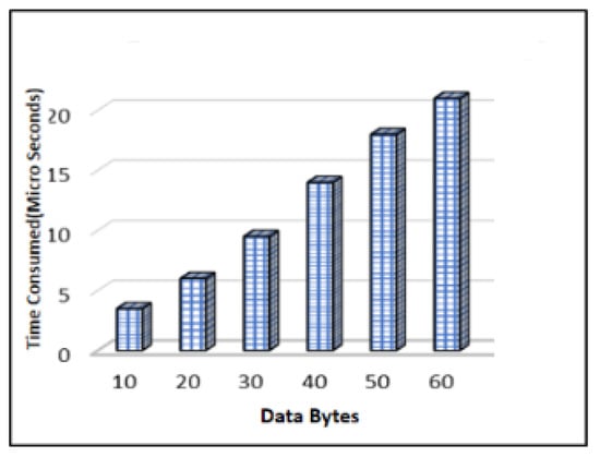 The computational time is the time it takes the ElGamal technique to produce a key. The data bytes and time taken by the method to create the key for the encryption procedure are shown in Figure 8. The time used by the procedure increases as the number of data bytes increases. For 30 bytes, it takes 9.5 microseconds to compute the data bytes for key production, whereas for 60 bytes the same operation takes 21 microseconds.