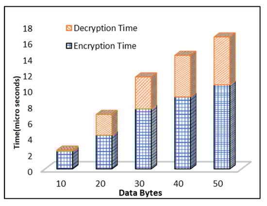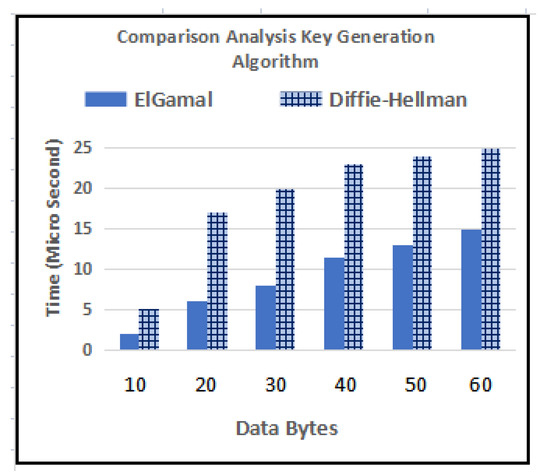 The ElGamal key generation algorithm is used to support the proposed encryption scheme, and its comparison analysis is performed with the Diffie–Hellman Key generation method [38]. In Figure 9, it is observed that as the data bytes increased, the time taken also increased—e.g., one data byte took approximately 2 microseconds in the ElGamal method and the Diffie–Hellman increased to 5 microseconds at same amount of data byte.