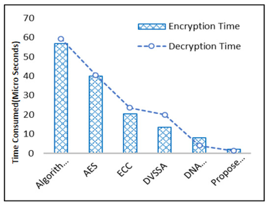 The encoding time of the different schemes is contrasted with the DEA’s proposed algorithm. Compared to the other methods, Figure 11 shows that the data encryption process took less time for the proposed algorithm. For encryption, DEA has less time complexity. Multiple schemes of decryption times are checked because the suggested DEA algorithm has less time complexity compared to other data decryption schemes. The AES-CTR, ECC, and suggested DEA algorithms are timed. AES-CTR takes about 40 microseconds and requires many calculations, whereas DEA takes around 4 to 5 microseconds and requires many computations.