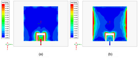 The dual-band antenna was designed and simulated using a full-wave simulator. The surface current distribution of the designed dual-band antenna at the operating frequencies is first analyzed for a better understanding. First, the current distribution at 28 GHz (phase = 0) is examined, as shown in Figure 2a. The smaller patch controls the resonance in the upper band. Indeed, the upper band patch operates at its fundamental TM10 mode, while the lower band patch remains undisturbed. Similarly, Figure 2b illustrates the current distribution of the dual-band patch antenna at 5.9 GHz (phase = 90). It is clear that the current mainly flows over the lower band patch at 5.9 GHz through the coupling from the upper band patch. A time delay is indicated due to the direct excitation of the high-frequency antenna. When the antenna operates at 28 GHz, the coupled signal travels a specific distance, introducing a delay. Since the exact delay of the signal is unknown, a reference point, such as a peak or null point, or a phase of 90 degrees, can be considered. This reference point helps to account for the signal delay and appropriately align the phases.