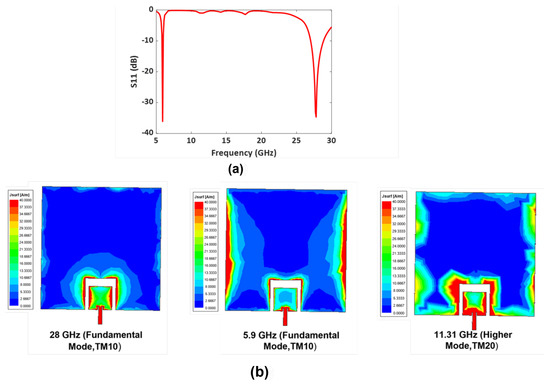 (a) Simulated S11 (dB) of Design I: Dual-band antenna operating at 5.9 GHz and 28 GHz. (b) Antenna with fundamental mode and higher modes.