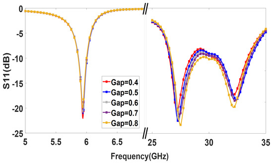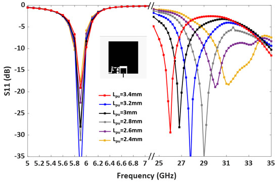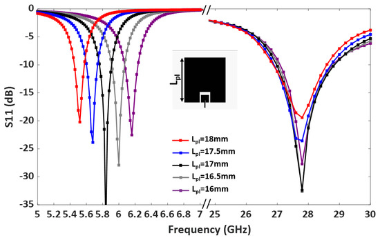 A parametric study was carried out to further analyze the patch lengths’ effect on the operating frequencies. Figure 4 demonstrates that adjusting the length of the lower band patch shifts the lower band resonance. Similarly, the length of the upper band patch, , controls the upper band resonance, as shown in Figure 5. Therefore, the operating frequencies of the upper and lower bands can be easily tuned by controlling and .