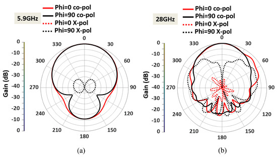 Simulated radiation pattern of the dual-band antenna with enhanced bandwidth within both E (XZ) and H (YZ) planes at (a) 5.9 GHz, and (b) 28 GHz.