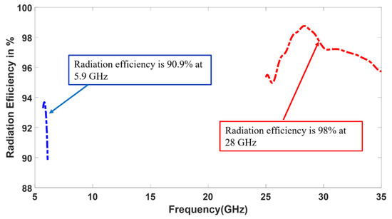 Simulated Radiation efficiency of the dual-band antenna with enhanced bandwidth at 5.9 GHz and 28 GHz.