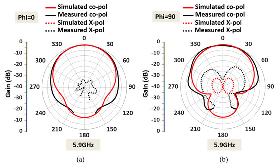 The measured radiation pattern of the dual-band antenna with enhanced bandwidth at 5.9 GHz is presented in Figure 13. The simulated and measured radiation patterns at 5.9 GHz agree well in both the E plane ( = 0) and the H plane ( = 90). Similarly, the fabricated dual-band antenna provides low cross-polarization levels at 5.9 GHz in both the E and H planes. The antenna offers a measured HPBW of 92° in the E plane and 102° in the H plane. A measured peak high gain of 7.7 dBi is observed in the lower frequency band, as shown in Figure 14. The antenna has a directional radiation pattern in both frequency bands.