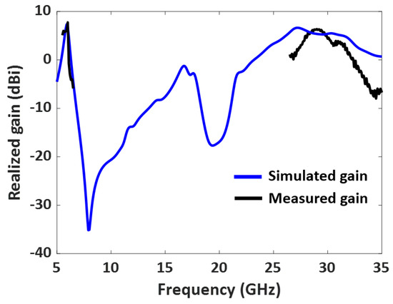 Figure 12 illustrates the measured S11 (dB) of the 50 impedance-matched dual-band antenna with increased bandwidth. The measured S11 agrees well with the simulated one, as displayed in Table 2. Moreover, the fabricated antenna provides a −10 dB impedance bandwidth from 5.8 GHz to 6.05 GHz, covering the DSRC band, and 26.8 GHz to 31.3 GHz, covering the 5G mm-wave band. Overall, the dual-band antenna provides a bandwidth of 250 MHz in the lower frequency band and a wide bandwidth of 4.5 GHz in the mm-wave band.