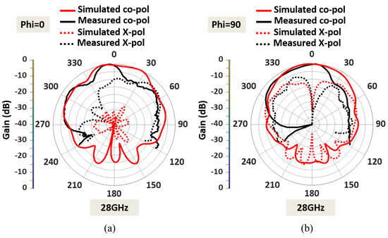 The measured radiation pattern of the fabricated antenna at 28 GHz is displayed in Figure 15. The discrepancies between the measured and simulated patterns were due to fabrication errors and the presence of the connector for the mm-wave frequency. The feedline for the 28 GHz patch is very thin; hence, the soldering needed careful attention close to the feedline. Moreover, the fabricated antenna was fed using a 2.4 mm end launch connector to measure the radiation. As a result of the connector’s cable loss, there are few discrepancies between the measured and simulated patterns. Figure 15 also shows that the dual-band antenna at 28 GHz provides an HPBW of 22° in the E plane and 63° in the H plane. A measured peak gain of 6.38 dBi is observed in the upper-frequency band, as shown in Figure 14. At 28 GHz, the cross-polarization levels in both the E and H planes are acceptable. The cross-polarization in the upper band can be further reduced by adding defective ground structures (DGS). Implementing DGS helps optimize the antenna’s performance by suppressing unwanted polarization and enhancing the desired polarization. This integration improves overall system performance and reduces cross-polarization effects during communication.