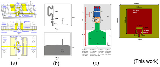 A simple way to realize dual-band antennas with a large frequency ratio is to integrate two different frequency antennas on the same aperture [7,8,9,10]. Multiband antennas on the same aperture reduce the cost and weight of the system. A multilayer dual-band antenna with a magneto-electric dipole and parallel-plate resonator on different layers operating at 5.9 GHz and 28 GHz was developed in [11]. However, the design requires expensive multilayer fabrication and suffers from a high profile (i.e., ).