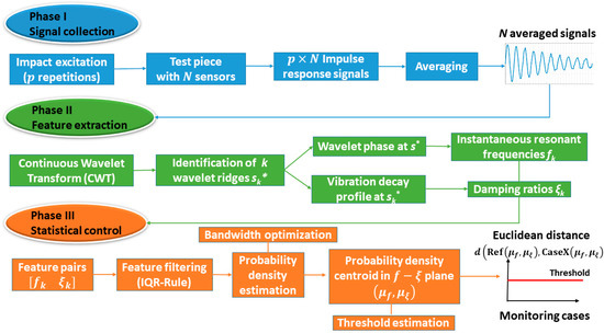 The damage detection algorithm proposed for an SHM system originates from an anomaly detection field. It has three distinct phases, namely, Phase I: signal collection, Phase II: feature extraction, and Phase III: statistical control, as shown in Figure 1.