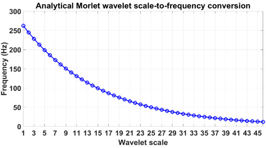 In Phase II, a time-frequency analysis of the averaged responses is performed using CWT. CWT analysis involves the identification of wavelet ridges from the ridge condition in Equation (2) in the time domain signal analysed. Wavelet ridges represent the oscillatory modes, which comprise the components of vibration decay signals. Subsequently, this ridge information from the ridges identified at is used to identify the resonant frequencies from wavelet phase (Equation (4)), and the decay profile of CWT coefficients in time domain is used to extract the damping ratios (Equation (6)). CWT analysis involves operating with wavelet scale parameters. In order to convert the scale parameter to frequency values, a wavelet scale-to-frequency conversion is realized through Equation (3) and is illustrated in Figure 2 for the analytical Morlet wavelet function. In this study, Morlet mother wavelet is used since it exhibits a high correlation with the time domain vibration data. This mother wavelet has been used for structural damage detection [23,24]. The identified modal parameter value pairs form features and that are organized into a two-column matrix , where rows correspond to observations and columns correspond to features. This feature matrix is used in the next phase of the anomaly detection algorithm proposed.