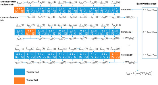 - In each training fold and the single testing fold, compute the KDE according to Equation (8) for each value of the bandwidth parameter. Then, compute an error between the KDEs of the testing and each training set according towhere is the number of folds.