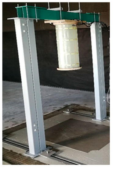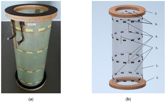 Testing objects are the structures in the form of cylinders fabricated from a composite material with the flanges made of plywood rings. The specimens are made of 300 g/m2 fibreglass fabric with a fibre orientation of 45° and LG 385 epoxy resin (HG 385 hardener). The weight of the specimen with the upper and lower flanges is 4.37 kg. Photo of a specimen is shown in Figure 4a. The specimen design includes (see Figure 4b):