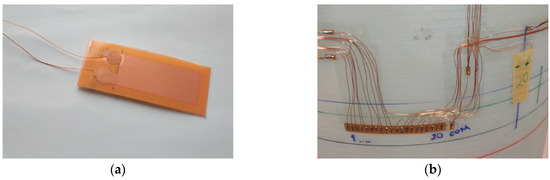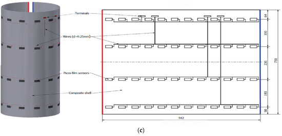 The sensor network of each specimen comprises 48 polyvinylidene fluoride piezo film sensors connected to four conductor terminals and wiring harnesses with connectors. These films are flexible, lightweight and have piezoelectric properties [3]. Due to these properties, a strain in the film causes a change in stress. The piezo film is located between two printed silver electrodes, forming a capacitor-like structure. The dimensions of the sensors are roughly 45 mm × 20 mm × 0.05 mm, electrical capacity of 1.3 nF, operating temperature from −40 °C to 60 °C. The view of the sensor prepared for gluing on the specimen is shown in Figure 5a. The wires used for the SHM system prototype are the small, lacquered copper wires with a diameter of 0.25 mm. These wires are glued to the sensors with a special two-component epoxy glue, after which the sensor is covered with a nonconductive insulating tape. The electrical conductors connecting the sensors with the terminals (Figure 5b) are laid in the form of bundles in the longitudinal and circumferential directions and fixed with adhesive tape. On each terminal, 12 similar (conditionally signal) conductors are assembled on 12 contacts and 12 conditionally negative conductors on one common contact. Bundles of wires are soldered to the terminal contacts. The sensors are installed on the specimens in accordance with the premade markings, as shown in Figure 5c. At this stage, the sensor network is covered with a protective composite layer, and the specimen is glued into the annular grooves of the flanges.