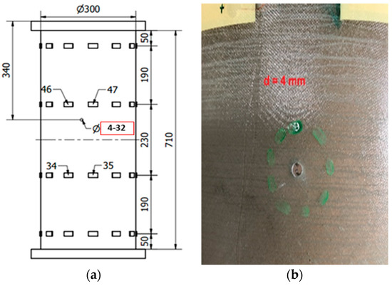 The test cases realized in the current study involve reference state and progressing damage, namely, a circular hole drilled through the thickness of the cylinders in the same location. Diameter of the hole is increased in five stages as follows—4, 8, 16, 24, and 32 mm. The location of the hole schematically is shown in Figure 7a, while the close-up photo view of a 4 mm hole is shown in Figure 7b.