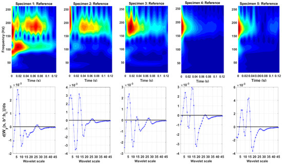 CWT scalograms at the reference state for the averaged time domain responses are shown in Figure 9. The scalogram is a useful analysis tool for signal analysis in joint time and frequency domains via the CWT. It is a 3D plot providing an indication of relative energy distribution across wavelet scales (related to frequencies) and time instants. Red regions mark the coordinates in time-frequency plane with high energy localization. Ridge identification using the ridge condition is shown on the bottom plots. The identified ridges and the corresponding frequencies are presented in Table 1. The frequencies correspond to the ones from the scale-to-frequency conversion from Figure 2 and do not consider variations associated with individual specimens. The vibration modes at scales 6 and 14, corresponding to 185.3 Hz and 106.4 Hz were identified for all five specimens. The vibration mode at scale 7 (172.9 Hz) was identified for all specimens, except for the second, while the vibration mode at scale 5 (198.6 Hz) was identified only for the first and fourth specimens.