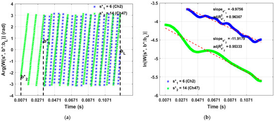 By plotting versus the time axis, a straight line is obtained for most of the time span of response because the modulus of CWT coefficients decays exponentially with time. This straight line is fit with a linear function, and the slope parameter is extracted. This slope parameter is equal to