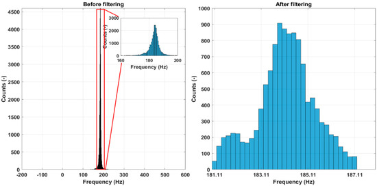 The results of the frequency filtering for the vibration mode at 185 Hz (scale 6) at a reference state for specimen No. 2 are illustrated using histograms in Figure 11 and shown numerically in Table 2. There are significant outliers in the extracted instantaneous frequencies for all specimens. The small inset shows a histogram of the zoomed-in portion before filtering the histograms, ignoring the outlier values. The histograms on the right show the results after filtering. The bimodal character of frequency distribution can be traced. The results in Table 2 show that while the mean frequency values change only slightly, the standard deviation and, especially, frequency range reduced drastically after the filtering process.