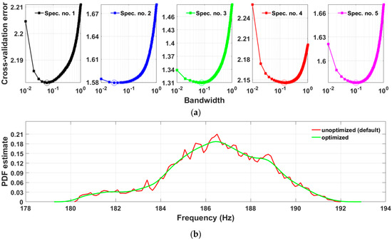After feature filtering, the next step is computation of the KDE of the filtered features. It was shown that feature values do not follow a clear normal distribution; therefore, KDE is an appropriate tool for the estimation of the underlying probability density. In the bandwidth optimization routine, bandwidth values were set from 0.01 to 1, with a total of 100 values for testing. The bandwidth parameter optimization results for specimens at the reference state are shown in Figure 12a. It can be seen that the optimum bandwidth parameters are different for different specimens even if they are designed to be equal. The range of optimum bandwidths is from 0.03 (specimen No. 2) to 0.14 (specimen No. 4). The optimized KDE of the resonant frequency distribution at scale 6 for the specimen No. 1 at reference in comparison to a KDE obtained with a default bandwidth parameter is shown in Figure 12b. The optimization procedure removes the spikes of the KDE producing a smooth curve.