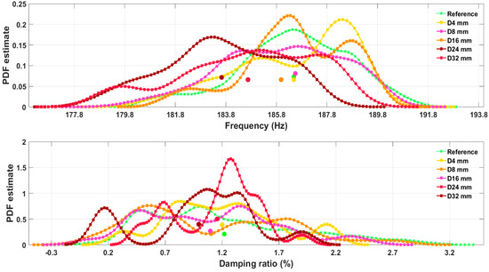 The optimized KDEs for a specimen No. 1 are shown in Figure 13. Here, all damage scenarios are shown along with the reference for both resonant frequency and damping ratio features. Centroids are marked as filled circles of a colour corresponding to one of the associated KDE. The KDEs reveal complex multimodal distributions, indicating that the underlying probability densities are, in fact, not classical Gaussian for all damage cases.