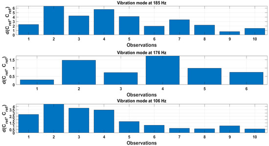 where data in this study are the filtered feature values. Thus, both quantities, and , are calculated for reference and all monitoring cases. Next, the centroid values of both features are organized into a row vector for each case at hand, and the Euclidean distances between centroids at reference and each monitoring case are calculated as