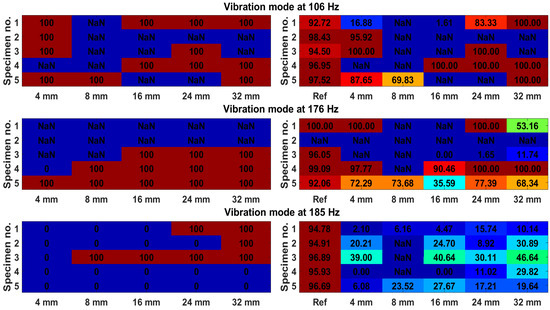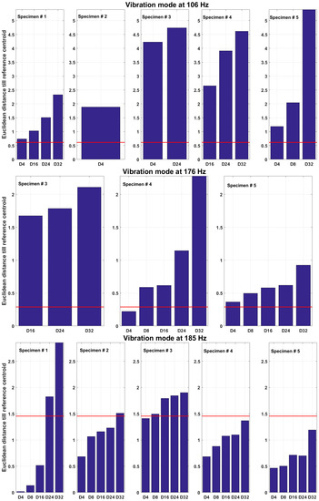 The damage detection results are displayed in Figure 15. Red horizontal line shows the threshold level. The scales for the Euclidean distances for each mode of vibration are set to the maximum value among all five specimens to compare the magnitude of deviation at the reference among different specimens. First of all, it can be seen that the values of the Euclidean distances are increasing with progression of damage, indicating that the approach proposed is sensitive to changes in damage severity. Secondly, the largest overall deviations from the reference state are observed for features from the vibration mode at 106 Hz. Furthermore, the values of Euclidean distance for all damage scenarios are above the threshold level for all specimens. From this perspective, the vibration mode at 185 Hz yields the poorest results since only the most severe damage cases are detected (above the threshold) for specimens Nos. 1, 2 and 3. No damage for this vibration mode is detected for specimens Nos. 4 and 5. Almost all cases of damage were detected for the vibration mode at 176 Hz. These observations indicate that it is crucial to consider multiple modes when detecting damage since, firstly, there might be missed detections if features were extracted only from a single mode and, secondly, the features of different vibration modes display different magnitudes of deviations from the reference.