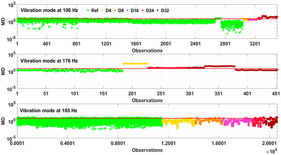 The damage identification results obtained were compared to the well-known Mahalanobis distance (MD) metric. The MD values follow a chi-squared (χ2) distribution [25,26]. Thus, threshold for the MD values is defined as an inverse of χ2 cumulative distribution function with υ degrees of freedom and a selected probability P: . The results of damage detection for specimen No. 1 are shown in Figure 16. The threshold level is selected at 95% probability and two degrees of freedom (corresponding to the two feature vectors in a feature matrix). It can be seen that while the majority of the green dots (reference MD data) lie under the threshold, the damage MD data are largely above the threshold for the vibration modes at 106 and 176 Hz. On the other hand, a poor damage detection can be seen for the vibration mode at 185 Hz, since a relatively small proportion of the damage MD data exceed the threshold.