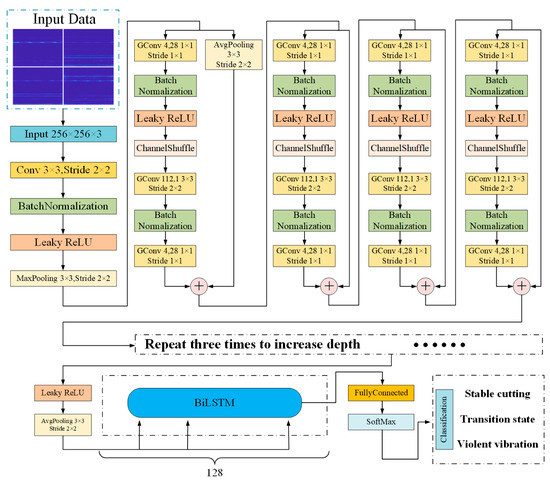 The network model is mainly composed of three parts: the shuffle unit module, BiLSTM module, and the vibration state monitoring module. Firstly, the 2D time–frequency spectrum of the three-way acceleration signal and the sound pressure signal extracted by SPWVD was adjusted to 0–255 grayscale images. A 256 × 256 × 3 matrix was formed by these images to realize the fusion of the two sensor signals in time–frequency domain features. Next, after the initial convolution pool and other operations, the shuffle unit was entered. The shuffle unit is mainly composed of the above group convolution and the channel shuffle, plus the necessary data batch normalization, pooling, and leaky RelU layers, and it imitates the residual network to increase the short-circuit mechanism, which avoids the gradient explosion problem in the training process, to a certain extent. Considering that the group convolution operation will reduce the accuracy of the network, multiple sets of shuffling units were added to increase the network depth. Then, after the shuffle unit, a BiLSTM layer was added to further extract the time series features of the data and adaptively filter the corresponding types of implicit features in the data. Finally, the learned features were fed back to the classification layer, composed of the fully connected layer and the SoftMax classifier, to identify and output the vibration state of the boring bar.