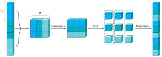 To solve the problem of grouping convolution, the channel shuffle method was introduced. After the channel shuffle method was applied to the grouping convolution operation, the channels of each group were further grouped according to the total number of groups, and then mixed with each other to ensure that each large group can have the characteristics of the other groups and be used as the input layer of the next convolution operation. The specific implementation method is shown in Figure 4. Let the number of feature layer groupings be G and the total depth be D. After combining them into (G, D), it was transposed and re-leveled to achieve channel shuffling. It can be seen from the diagram that the mixed channel after channel mixing avoided the separation and isolation between the above channels, to a certain extent.