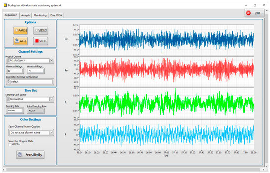 To establish the boring experiment dataset and provide enough data for the intelligent perception of the boring bar vibration state for training, boring experiments are needed. The experiment changed the boring cutting speed, feed rate, cutting depth, and boring bar overhang. The acceleration sensor was installed at the front end of the boring bar to collect the acceleration signal during the cutting process, the sound sensor was used to collect the noise pressure of the machining noise, and the surface roughness and image were recorded. The CNC lathe used in the experiment was the CKA6150 (Shenyang Machine Tool Group Co., Ltd., Shenyang, China), the cutting workpiece was 45 steel, the outer diameter was 180 mm, the inner diameter was 140 mm, the total length was 200 mm, the diameter of the boring bar was 60 mm, and the maximum overhang length was 600 mm. The blade model was CCMT060604, and the workpiece rotated during cutting, the boring bar feeds, there was no cutting fluid, and the maximum feed depth was 30 mm. The data acquisition hardware used the NI PXIE-1092 (National Instruments (NI) Inc., Shanghai, China) data acquisition box, integrated PXIE-4492 vibration and sound acquisition modules, and the software used the LabVIEW (National Instruments (NI) Inc.) data acquisition system. Through the trial cutting experiment, the collected signals were analyzed, and it was found that the highest frequency of the vibration signal and the sound pressure signal was not higher than 10 KHz. Under the premise of computer memory and computing resources, according to the Shannon sampling theorem, the sampling frequency was set to 40 kHz. The diagram and photos of the experimental site are shown in Figure 6, and Figure 7 shows the data acquisition interface.
