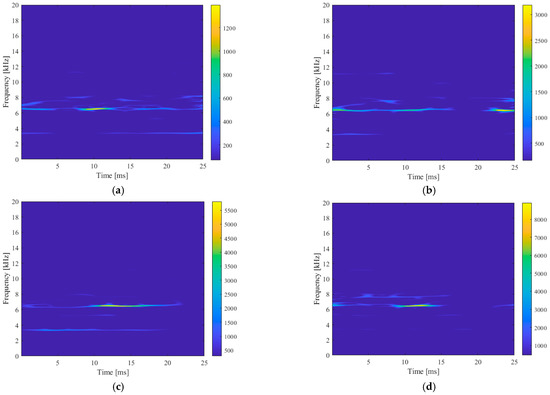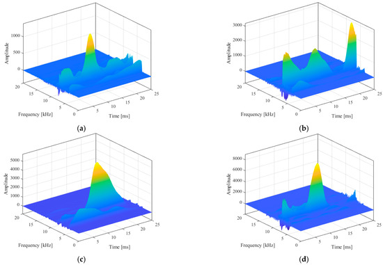 The time–frequency relationship of the signal can be roughly seen from the 3D time–frequency spectrum. In order to more intuitively express this relationship, the 3D image was projected downward along the z-axis (amplitude) direction to obtain a 2D time–frequency spectrum, as shown in Figure 10.