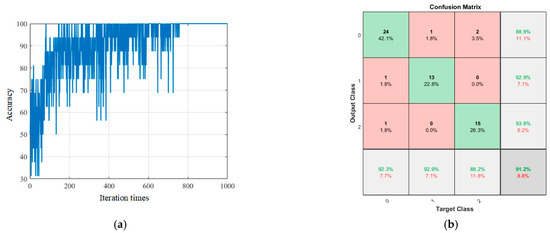 As shown in Figure 11a, after 756 iterations, the model training accuracy reached 100%, indicating that all groups in the training set were able to achieve correct classification.