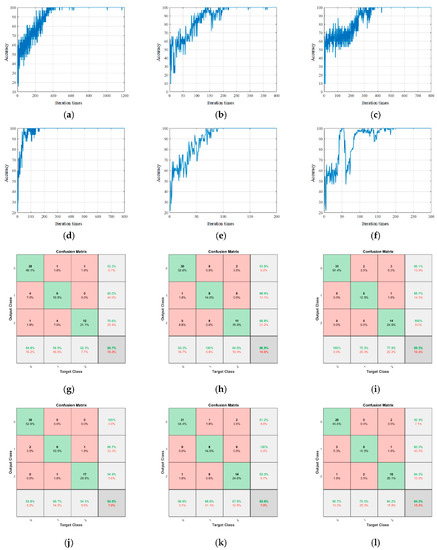 Training and test results of the comparison experiment. (a) CNN, (b) Shuffle NET, (c) Res NET, (d) Dense NET, (e) Inception NET, (f) single signal, (g) CNN, (h) Shuffle NET, (i) Res NET, (j) Dense NET, (k) Inception NET, and (l) single signal.