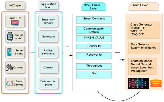 The proposed work incorporated the smart home architecture with a machine learning framework that included a Levenberg-based system model for the training and classification of class-generated data. The proposed work is divided into two sections: the blockchain layer and the cloud layer.