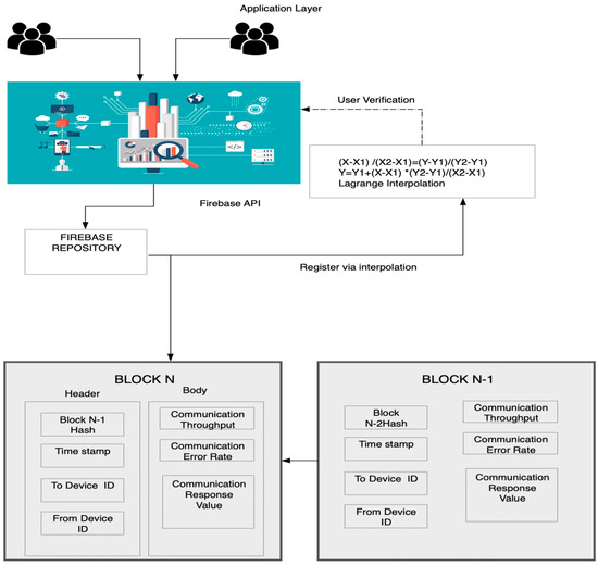The proposed blockchain layer was implemented using the Firebase blockchain platform to host the data. The architecture of the blockchain in Firebase was as follows. Firebase is a cloud-based platform that provides various tools and services for app development. It offers several features, such as real-time databases, cloud storage, authentication, and hosting. In order to use these features in a web or mobile application, the application needs to be configured with a Firebase project [21,22]. The configuration information is stored in a JavaScript object, commonly known as a firebaseConfig object. The given code represents the configuration details of a Firebase project. The firebaseConfig object contains several properties, such as apiKey, authDomain, databaseURL, projectId, storageBucket, appId, and measurementId. These properties hold unique values that are specific to a particular Firebase project. These values are used by the Firebase SDKs to establish a connection between the app and the Firebase services [23,24]. The pseudo-code represents the steps to initialize the firebaseConfig object and set the values for its properties.