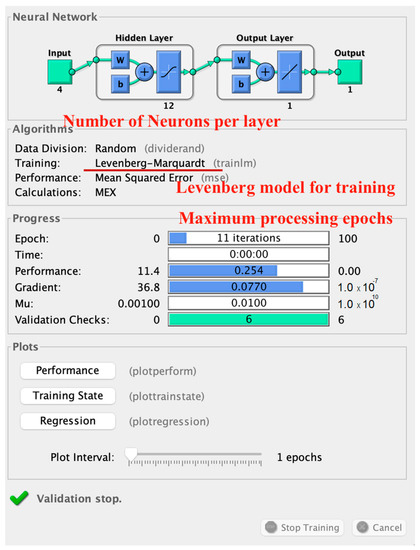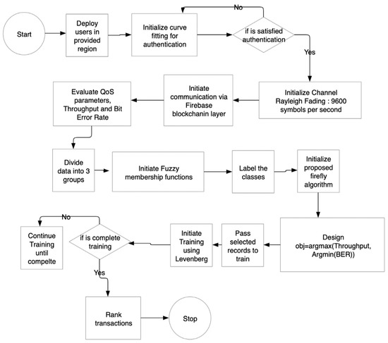 Figure 4 illustrates that the proposed work utilized four parameters, namely the sender id, the receiver id, the evaluated Throughput, and BER, as the input for the Levenberg model, in which the total number of supplied layers in the model was determined to be two, and there were a total of 12 active neurons per layer. The neurons were propagated for the minimum gradient, which was the Mean Squared Error in the case of the proposed work. The total number of supplied epochs per iteration was 100, and the gradient is attained between 5–15 epochs on average. The ground truth values for the data records were the class labels generated by the fuzzy inference engine. To classify a new example, the input was fed into the neural network, which generated an output. This output was a probability distribution over the three categories, indicating the probability that the input belonged to each category. The category with the highest probability was chosen as the classification. The proposed work was evaluated on the basis of QoS and the quantitative parameters that are illustrated in the next section.