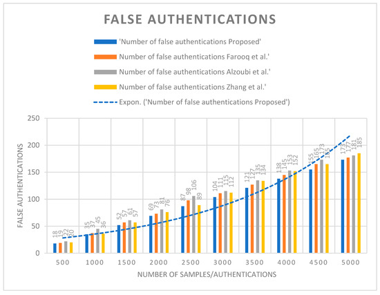 Number of false authentications against Farooq et al. [3], Alzoubi et al. [11], and Zhang et al. [21].