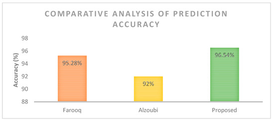 In terms of precision, the proposed method performed consistently well, with an average precision of around 0.97–0.98. The NB and RF methods had similar precision scores for most cases, but the RF method had lower precision for some test sample sizes, particularly for larger test samples. For recall, the proposed method performed well, with an average score of around 0.98–0.99. The NB and RF methods also performed well but with slightly lower scores than the proposed method. In terms of the F-measure, the proposed method again performed consistently well, with an average score of around 0.96–0.99. The NB and RF methods had similar F-measure scores in most cases, but the RF method had a lower F-measure for some test sample sizes, particularly for larger test samples. The performance of the proposed work was further compared for the prediction accuracy of false authentications. Figure 6 shows the comparative analysis of the proposed work performed against the existing works in terms of the prediction of false authentications. It was observed that the proposed work exhibited a high accuracy of 96.54%, which is a little higher than that exhibited by Farooq (95.28%) and Alzoubi (92%), thus justifying the effectiveness of the proposed work in smart home networks.