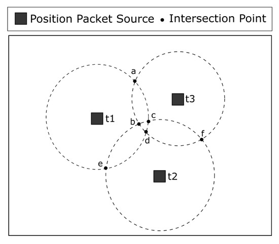 9]. When the sensor node receives position packets and calculates the intersection between them, it is not always able to find a common point where they intersect. Instead, it ends up with six different intersection points, as shown in