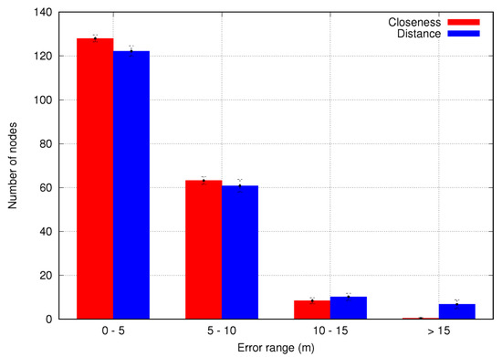 Figure 11 shows the number of nodes within different position estimation error ranges. As can be seen, closeness has more nodes in the small error range while distance exceeds closeness in larger error ranges. Thus, the closeness algorithm outperforms the distance algorithm because it considers all possible combinations of intersection points and chooses the closest points within a combination set to be used as reference points. Therefore, the closeness algorithm is used in the next simulations in order to obtain reference points.