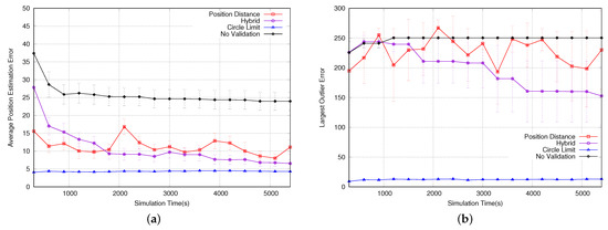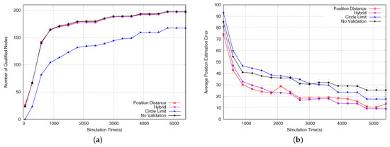 Figure 12b shows the average position estimation error, in terms of the distance between the estimated and actual position for all nodes. The position distance algorithm outperforms the circle limit algorithm because it validates and accepts more position packets. The hybrid algorithm starts to perform better than position distance over time because, after the sensor node is qualified, it starts running the circle limit algorithm, which results in better estimations. Although the algorithm with no validation accepts every position packet, it is outperformed by the other algorithms because it does not avoid situations depicted in